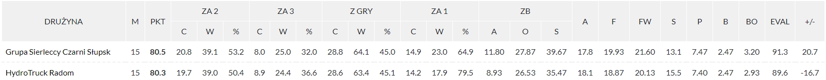 Na koniec przedstawimy porównanie statystyczne obu ekip. Widać na nim lepsze i gorsze strony drużyn. Jak widać, drużyna ze Słupska ma parcie na atakowaną deskę. Zastawienie w tym spotkaniu może być jednym z kluczy do zwycięstwa!